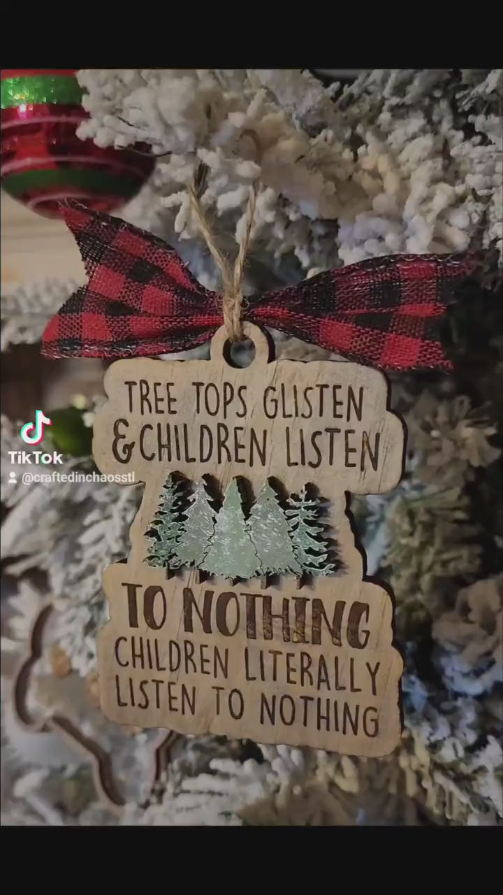 Add a sprinkle of humor to your holiday decor with this handcrafted wooden Christmas Tree Ornament. Embracing the beauty of winter with its frosted fir trees design and a playful quote that reads, "Tree tops glisten & children listen to nothing," this ornament is perfect for those who love a good chuckle with their Christmas cheer.
